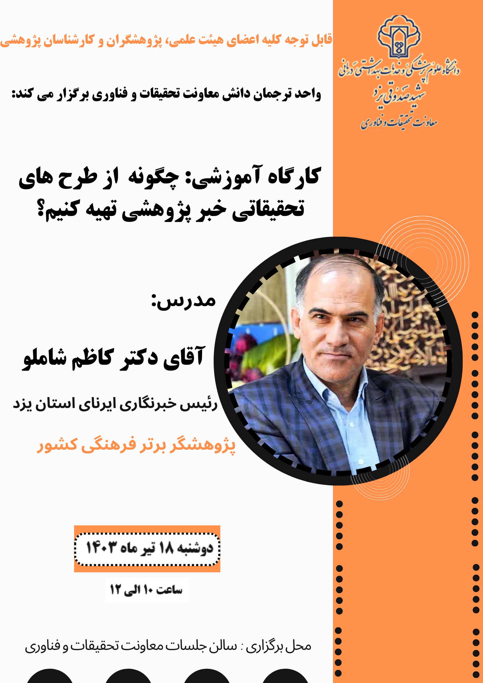 واحد ترجمان دانش معاونت تحقیقات و فناوری، کارگاهی تحت عنوان “چگونه از طرح های تحقیقاتی خبر پژوهشی تهیه کنیم؟” تدارک دیده است. این کارگاه، روز دوشنبه 18 تیرماه 1403 با تدریس “رئیس خبرگزاری ایرنای یزد” از ساعت 10 الی 12 در محل سالن جلسات معاونت تحقیقات و فناوری (واقع در مجتمع امام رضا(ع)) برگزار می گردد. با توجه به اهیمت بالای موضوع، از کلیه اعضای هیات علمی و پژوهشگران دعوت می گردد در این کارگاه که بصورت حضوری و مجازی برگزار می گردد شرکت نمایند.